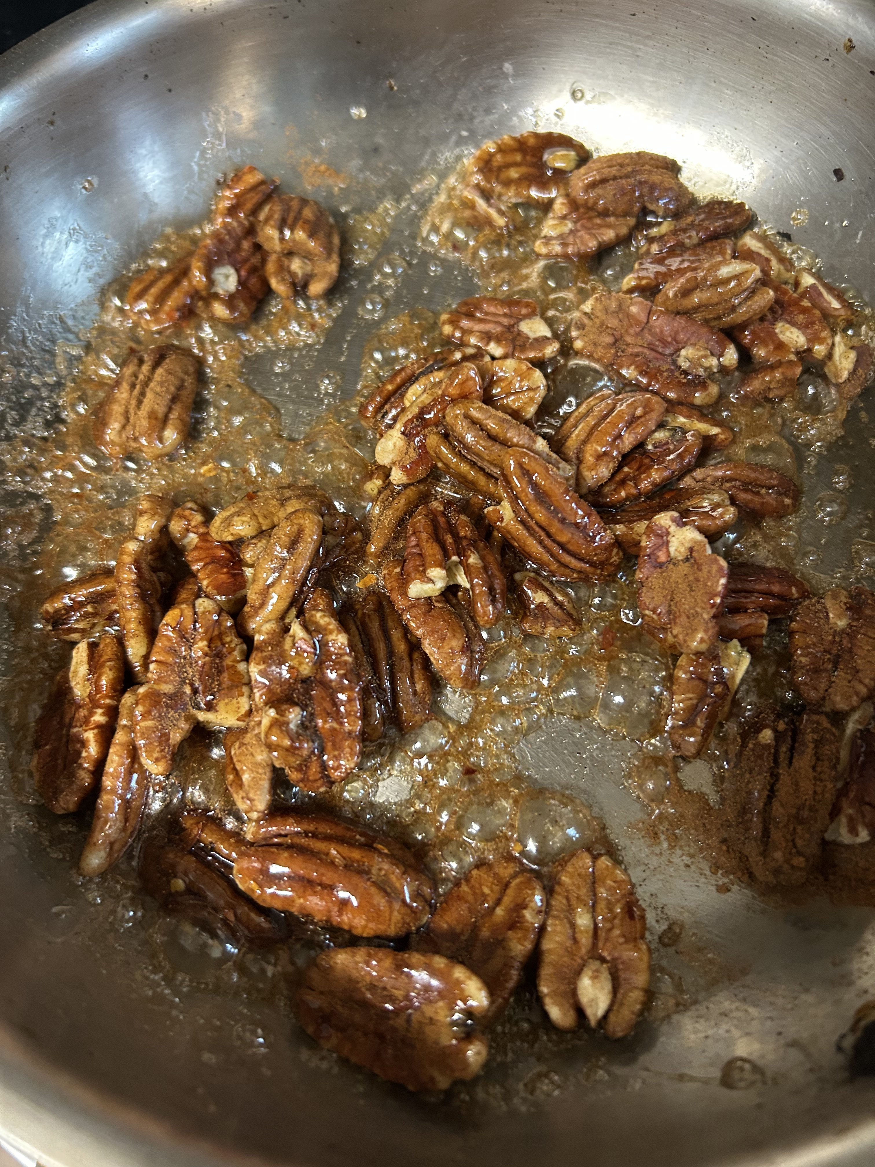Stir continuously for 4–5 minutes, until the syrup thickens and coats the pecans.