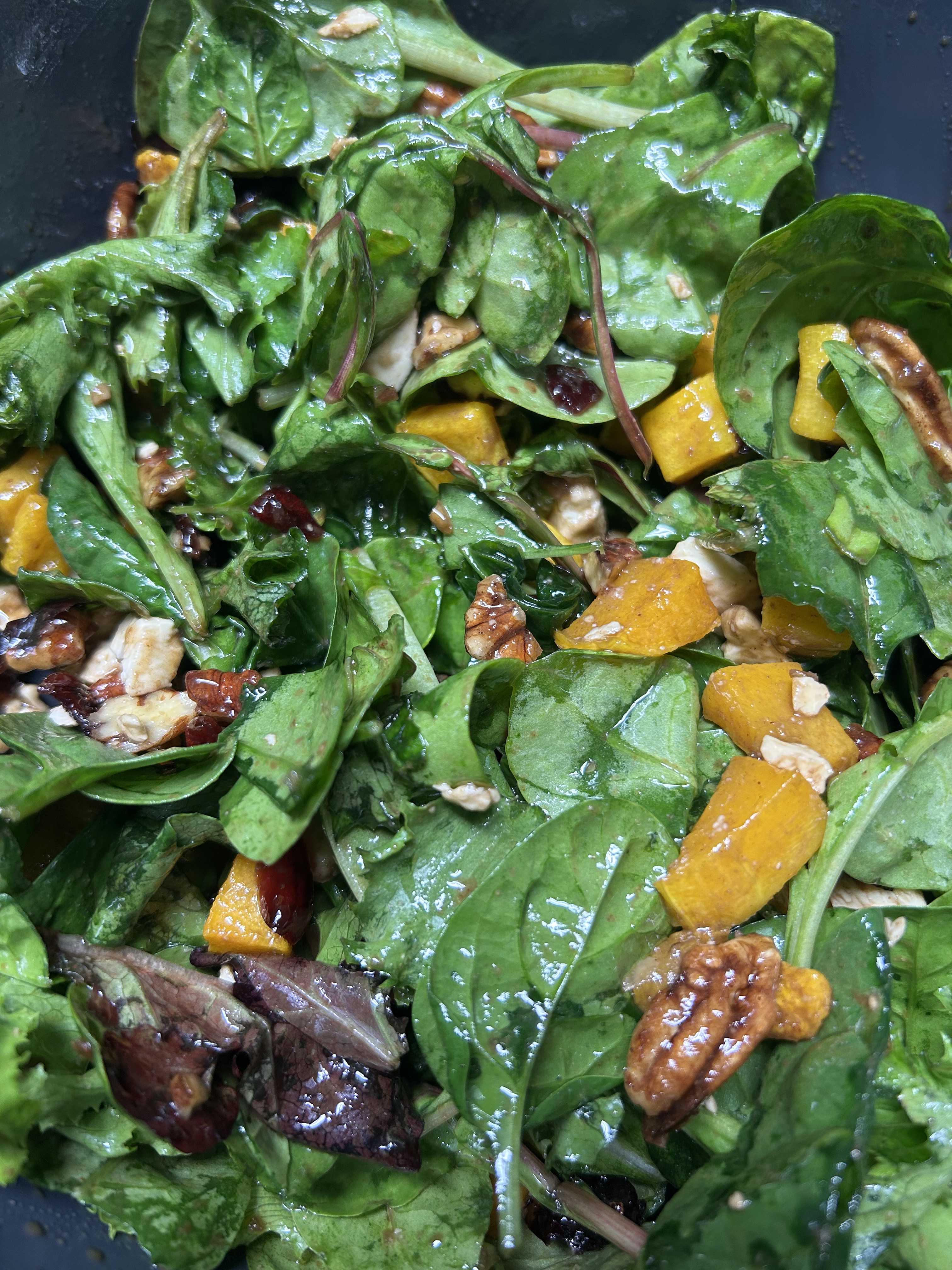 Layer on roasted squash, cranberries, crumbled feta, and candied pecans.